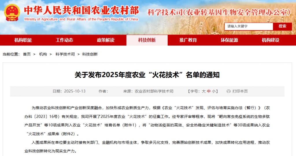我司技术成功纳入2025年度农业“火花技术”名单!