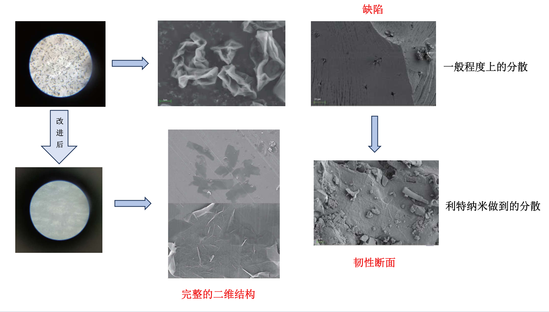 石墨烯材料对高分子材料的力学性能有较大的提升作用, 其物化性质及分散性决定了石墨烯应用时的性能表现。利特纳米经过与多家客户合作, 突破了一系列石墨烯在高分子领域应用中存在的问题。可根据不同的应用体系提供相匹配的石墨烯材料, 同时结合制品的加工工艺提供已将石墨烯材料均匀分散其中的添加剂, 包括液体形态, 如NMP 、DOP 、 DMF 、DMAC 、甲醇等分散液; 粉体形态, 如经石墨烯改性后的钙粉、氢氧化铝、氧化铝、气硅、陶土等复合体系。该类添加剂产品成本可控, 使用过程简单, 一般不需改变原配方和工艺。
